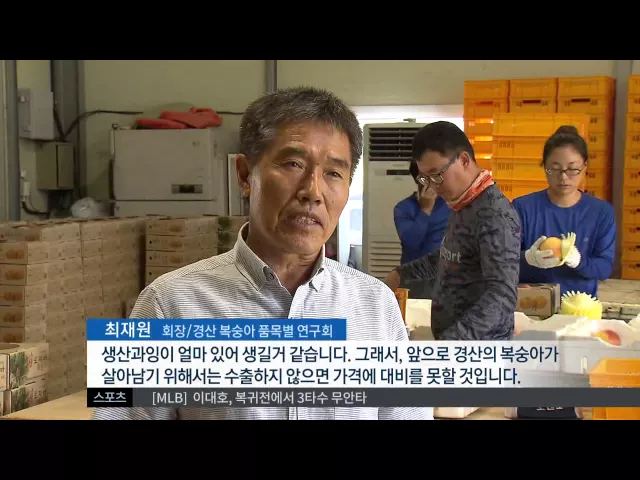 ◀ANC▶ 최근 몇 해 동안 복숭아는 다른 과일에 비해 시세가 좋았는데요. 하지만 요즘, 경기 하락에다 공급 과잉으로 위기감이 커지면서, 농가들이 수출로 돌파구를 마련하고 있습니다. 한태연기자가 보도합니다. ◀END▶ ◀VCR▶ 탐스럽게 익은 복숭아를 상처나지 않도록 조심스럽게 상자에 옮겨 담습니다. 경산시 진량...