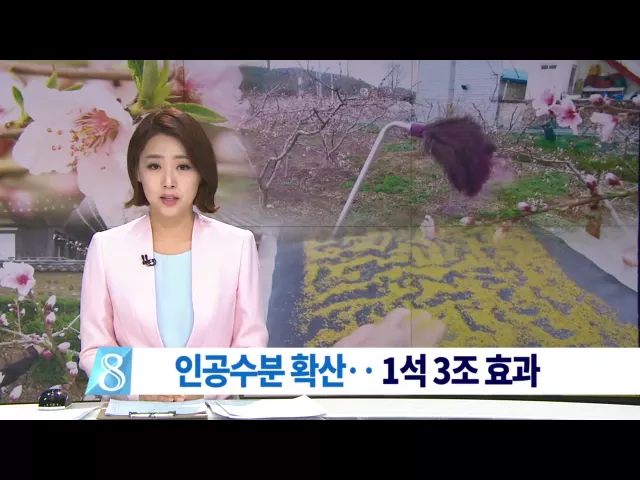 ◀ANC▶ 과수 농가의 인공수분이 확산되고 있습니다. 과일이 많이 열리고, 냉해도 줄일수 있는데다 작업시간도 단축돼 일석 삼조의 효과가 있기 때문입니다. 한태연 기자가 보도합니다. ◀END▶ ◀VCR▶ 영천에서 복숭아 농사를 하는 권후봉 씨는 올해도 어김없이 깃털이 달린 기계로 인공수분을 하고 있습니다. 붓 대신...