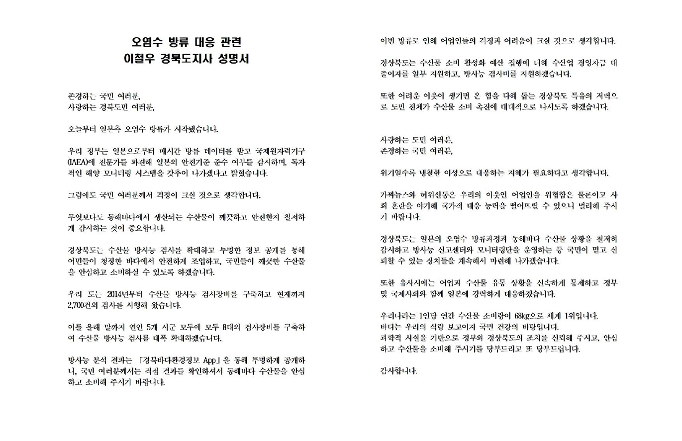 일본의 오염수 방류와 관련해 이철우 경상북도지사는 "독자적인 해양 모니터링 시스템을 갖춰 나가겠다"고 밝혔습니다.이 지사는 "수산물 방사능 검사를 확대하고 투명한 정보 공개를 통해 어민들이 안전하게 조업하고 국민들이 깨끗한 수산물을 안심하고 소비할 수 있도록 하겠다"고 밝혔습니다.경상북도는 "지난 2014년부...