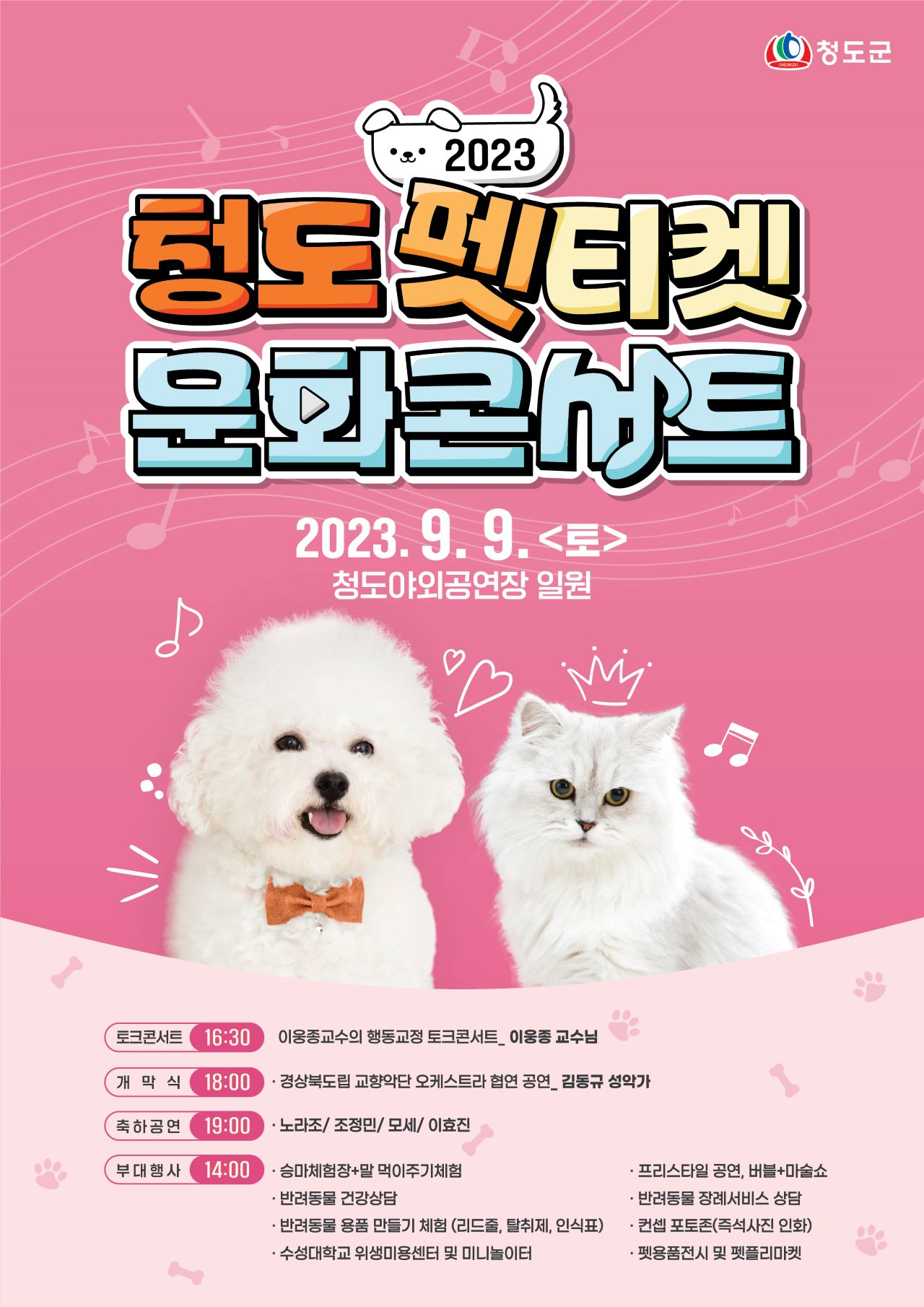 반려동물과 함께 즐길 수 있는 콘서트가 청도에서 열립니다.경북 청도군은 9월 9일 청도야외공연장에서 '2023 청도 펫티켓 문화콘서트'를 엽니다. 반려견 심리전문가의 토크콘서트를 비롯해 유기견 입양캠페인, 반려동물 건강 및 위생·미용 상담, 반려동물 장례서비스 상담 등의 프로그램으로 구성됐습니다.프리스타일 애견...