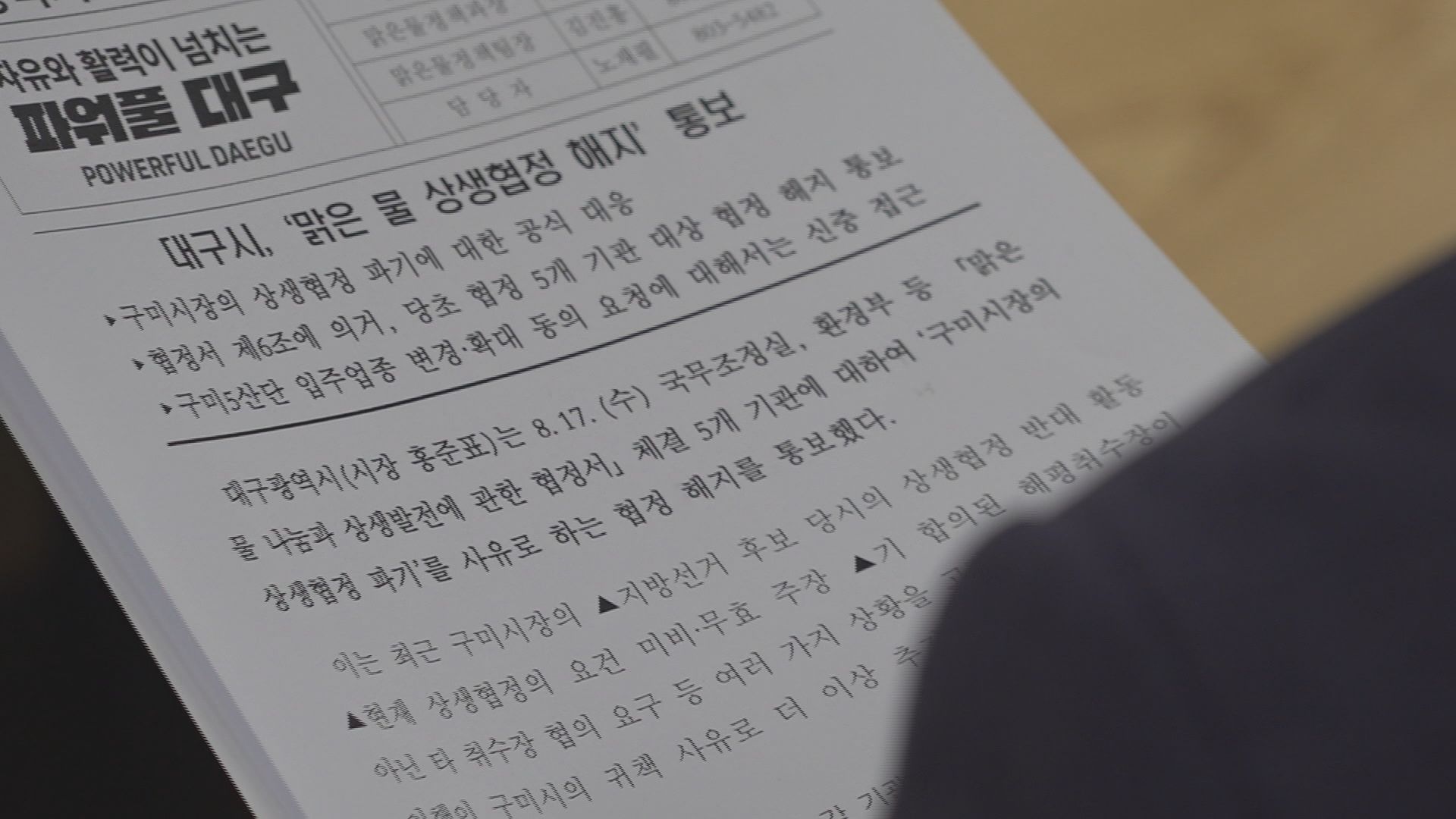 대구시가 '맑은 물 상생 협정'을 해지 통보한 것과 관련해 구미시가 유감을 나타냈습니다.구미시는 대구시에 '대구시의 상생 협정 파기에 따른 구미시의 입장 통보' 공문을 발송하고, "대구와 맑은 물을 공유해야 한다는 기본 입장에는 변화가 없다고 여러 차례 밝혔다"면서 대구시의 일방적 파기 통보와 관련해 유감을 나...
