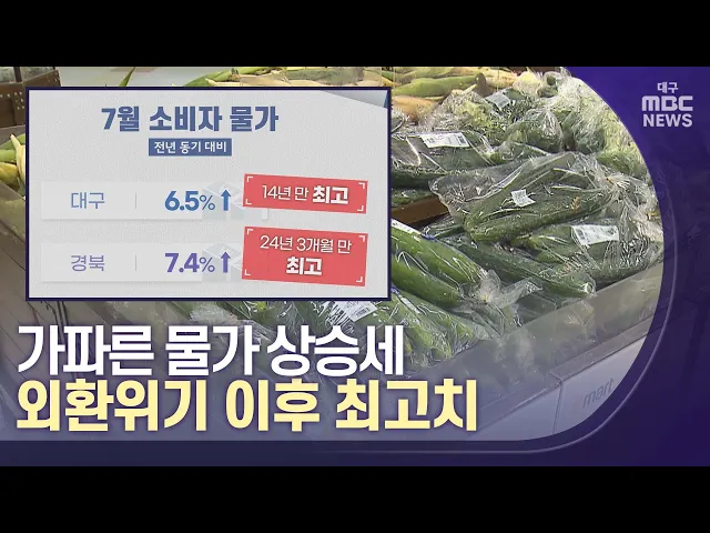 ◀앵커▶소비자물가가 무섭게 오르고 있습니다.7월 대구와 소비자물가 상승률이 6.5%, 경북은 7.4%를 기록했는데요. 경북은 외환위기 이후 24년 만에 가장 큰 폭의 상승률을 보였습니다.물가 상승세는 당분간 계속될 전망이어서 가뜩이나 어려운 서민 경제에 큰 부담을 주고 있습니다.한태연 기자 나와 있습니다. 한태연 기자...