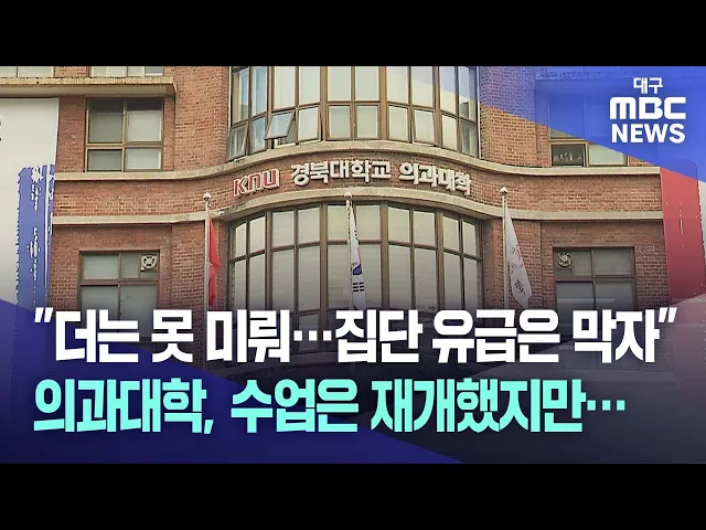 ◀앵커▶의대생들의 집단 휴학과 수업 거부로 중단됐던 의대 강의가 경북대를 시작으로 속속 재개하고 있습니다. 더 미뤘다가는 수업일수를 채우지 못해 대량 유급이 불가피하기 때문입니다. 수업은 대부분 비대면 온라인으로 동영상을 시청하는 방식인데, 실제 의대생 복귀로 이어질지는 미지수입니다.박재형 기자가 취재했...