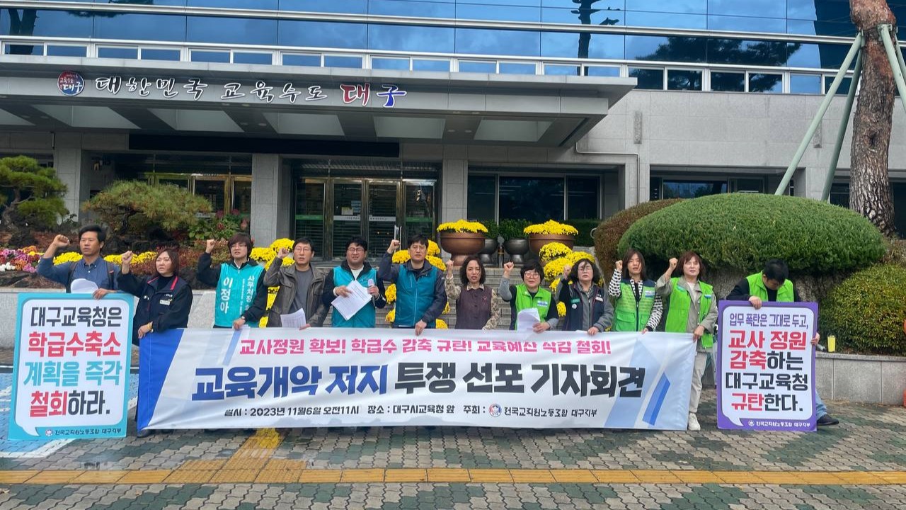 사진 제공 전국교직원노동조합 대구지부대구 지역 교사들이 교사 정원 및 학급수 감축을 규탄하고 교육예산 삭감 철회를 촉구했습니다.전교조 대구지부는 11월 6일 대구시 교육청 앞에서 기자회견을 열고 "교육부가 교원 정원과 기간제 교사를 무리하게 줄이고 있는데도 대구시 교육청은 의견 수렴이나 교육예산의 효율적 ...