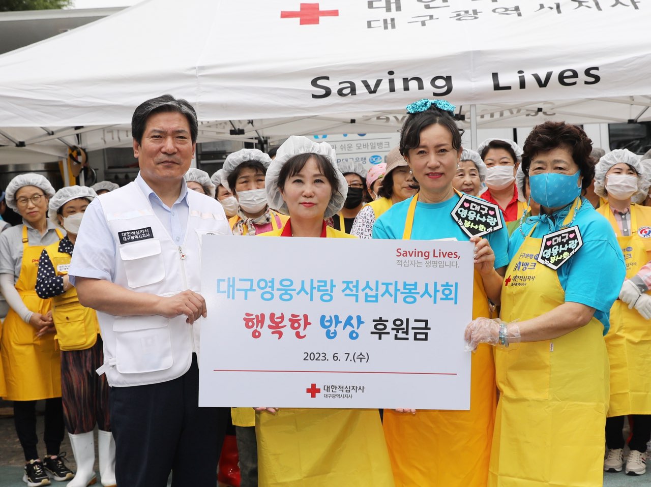 사진 제공 대한적십자사 대구시지사대한적십자사 대구지사(회장 박명수)와 대구영웅사랑 적십자봉사회(회장 배정희)는 6월 7일 두류공원에서 취약계층 어르신 1,000명을 대상으로 행복한 밥상(무료급식) 봉사활동을 실시했습니다.이번 급식은 대구영웅사랑 적십자봉사회의 후원금으로 마련됐습니다.배정희 회장을 비롯한 봉...