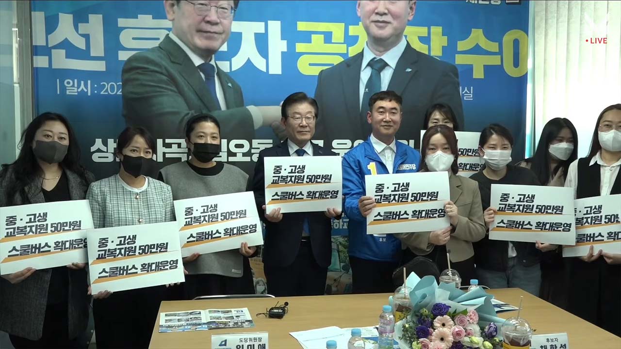 사진 유튜브 델리민주 캡처더불어민주당 이재명 대표가 오늘 오후 경북 구미에서 4·5 재보궐선거 구미 제4선거구 경북도의원에 출마한 채한성 후보에 대한 지원 유세에 나섰습니다.이 대표는 해당 선거구 내 학교 운영 위원들과의 간담회에서 채 후보의 공약인 '스쿨버스 확대 운영', '중고생 교복 지원금 상향' 등에 대해 ...
