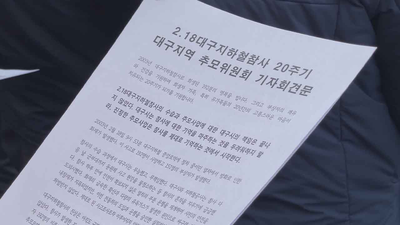 오는 2월 18일 대구지하철참사 20주기를 앞두고 '대구지하철참사 20주기 추모위원회'는 15일 낮 1시 반 국회에서 기자회견을 열고 대구지하철참사 20년이 지난 현재의 실상을 알리고 희생자들에 대한 명예 회복 등을 촉구할 예정입니다.기자회견에는 대구지하철참사 유가족, 이태원 참사 유가족 등 재난 참사 유가족들이 참...