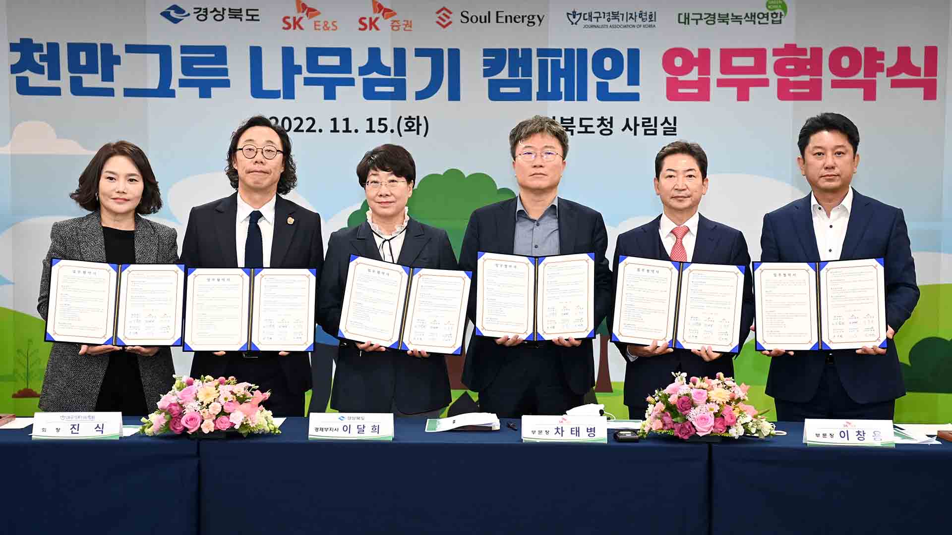 경상북도는 11월 15일 도청 회의실에서 SK ES(에스케이 이앤에스), SK증권, 소울에너지, 대구·경북 기자협회, 대구·경북 녹색연합과 '천만 그루 나무 심기 캠페인' 업무협약을 체결했습니다.이번 협약은 ESG(이에스지) 경영 실천 기업인 SK ES, SK증권, 소울에너지가 조성한 천억 원의 기금으로 산불피해지 복구, 도시공원 ...