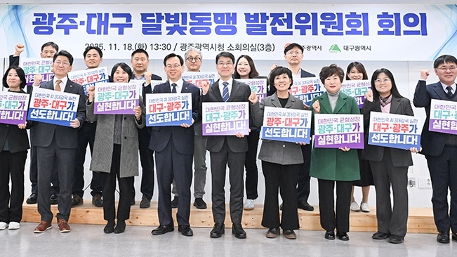 대구시와 광주시는 11월 18일 광주시청에서 '대구·광주 달빛동맹 발전위원회'를 열고 신규 과제 11건을 추진하기로 합의했습니다.두 도시는 대구·광주 AX 거점 도시 조성, 인공 지능 융합 핵심 인재 공동 양성, 미래 모빌리티 산업 육성을 위한 공동 과제 발굴, 공공기관 2차 이전 등 11개 과제 협력에 뜻을 모았습니다.대...