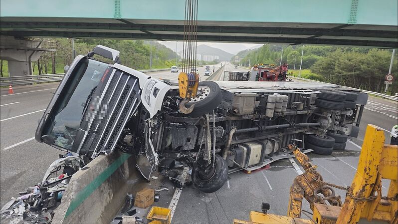사진 제공 송영훈5월 18일 새벽 6시 10분쯤 경부고속도로 부산 방면 남구미 나들목 부근에서 8.5톤짜리 화물차가 앞서가던 2톤 화물차와 부딪혔습니다.차량 2대가 모두 전도됐지만, 다친 사람은 없었습니다.사고 충격으로 중앙분리대가 파손됐고, 서울 방향 고속도로에 콘크리트 파편이 떨어져 1톤 화물차가 추돌하는 사고...