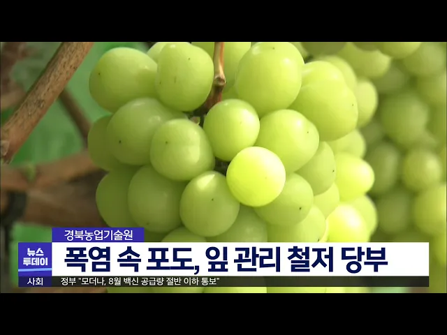 경상북도 농업기술원은 폭염으로 햇빛데임 등의 현상이 발생해 포도 크기가 저하하고, 당도와 착색 등 품질이 저하될 수 있다며 농가에 세심한 관리를 부탁했습니다.시설 내 고온이 지속되면 포도알은 35도에서 3.5시간, 40도에서 1시간 안에 피해가 나타나기 때문에 공기 순환 팬을 이용해 정체된 더운 공기를 순환시켜야 ...
