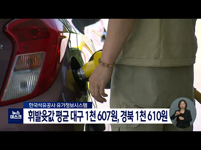 대구·경북 지역 휘발윳값 평균이 천 600원을 넘어 고공 행진을 하고 있습니다.한국석유공사 유가 정보 시스템 '오피넷'에 따르면 오늘 대구 지역 주유소의 평균 휘발윳값은 리터당 천 607원, 경북은 리터당 천 610원으로 나타났습니다.대구의 휘발윳값은 지난해 11월 3일 리터당 천 284원까지 떨어진 뒤 8개월 연속 상승세...