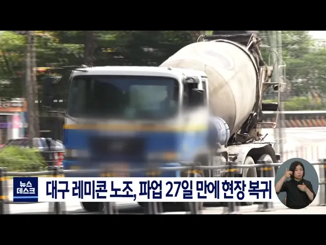 레미콘 운송 단가 인상을 요구하며 지난달 10일부터 운송 거부에 돌입했던 대구 레미콘노조가 파업 27일 만인 오늘 170여 개 건설 현장에 복귀해 운송을 재개했습니다.한국노총 레미콘운송노조 대구지부는 어제 레미콘 제조사들과의 협상에서 1회당 레미콘 운송비를 기존 3만 3천 원에서 4만 8천 원으로 인상하는 데 합의했...
