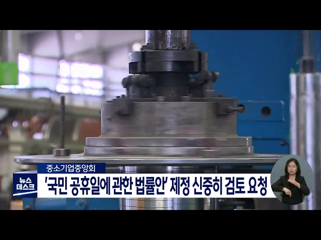 국회가 추진 중인 '국민 공휴일에 관한 법률안' 제정과 관련해 중소기업중앙회가 논평을 내고 해당 법률안을 신중히 검토해 달라고 요청했습니다.중소기업중앙회는 공휴일 법안이 통과되면 중소기업 현장에서 5인 미만까지 공휴일이 확대돼 소상공인 부담이 커지고, 생산 차질과 인건비 증가가 불가피해진다고 주장했습니다...