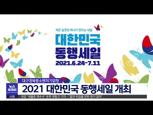 대구경북지방중소벤처기업청은 코로나 19 장기화로 어려움을 겪는 중소기업과 소상공인의 판로를 개척하고 소비를 촉진하기 위해 오는 24일부터 다음 달 11일까지 '2021 대한민국 동행세일'을 개최합니다.G마켓, 11번가, 쿠팡 등 27개 온라인 쇼핑몰을 통해 중소기업, 소상공인이 생산한 제품을 최대 70%까지 할인 판매를 ...
