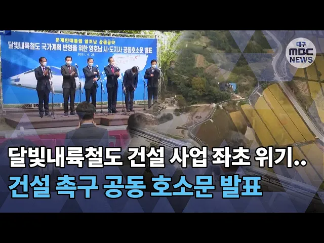 ◀ANC▶달구벌 대구와 빛고을 광주를 잇는 달빛내륙철도 건설 사업이 좌초될 위기에 놓였습니다.경제성을 이유로 국가철도망 구축 계획 초안에 반영되지 않은 건데요,영호남 6개 광역단체장이 경남 거창에서 공동 호소문을 발표하며다시 반영시켜 줄 것을 정부에 요청했습니다. 보도에 박재형 기자입니다. ◀END▶ ◀VC...