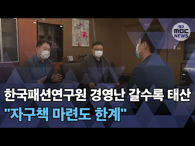 ◀ANC▶대구 3대 섬유 관련 전문연구기관 중 하나인한국패션산업연구원의 경영 위기가 갈수록 태산입니다.이사회가 연구원 건물을 담보로 한 대출을 승인해 줘 경매에 넘어갈 위기를 넘기나 했더니 정부가 제동을 걸었습니다.강력한 자구책 마련이 뒤따라야 한다는 이유에섭니다.박재형 기자가 취재했습니다. ◀END▶ ◀...