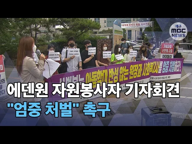 대구 아동양육 시설인 에덴원에서 일어난 아동학대 의혹과 관련해 봉사 후원단체들이 오늘 대구지방법원 앞에서 기자회견을 열고 원장과 사회복지사를 엄중 처벌하라고 주장했습니다. 이들은 사회복지사로서의 의무를 저버리고 아동학대를 한 혐의를 받고 기소된 원장과 사회복지사가 다시는 아동 시설에 종사할 수 없도록 ...