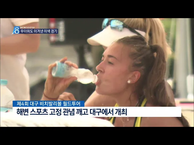 ◀ANC▶ 푹푹 찌는 찜통더위 속에 내륙 지역에서 좀처럼 보기 힘든 비치 발리볼 대회가 열렸습니다. 도심 속에서 펼쳐진 이색 경기에 시민들은 더위를 잠시 잊었습니다. 박재형 기자입니다. ◀END▶ ◀VCR▶ 시원한 스파이크가 네트를 가르며 상대 코트에 내리꽂힙니다. 잠시도 눈을 뗄 수 없는 화끈한 공격력에 대구 도...