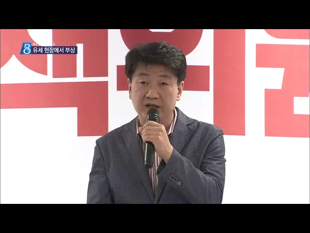 ◀ANC▶ 권영진 한국당 대구시장 후보가 유세 도중 한 장애인 단체 회원이 밀치는 바람에 넘어져 다치는 일이 벌어졌습니다. 권 후보측은 테러라고 규정하고 있는 반면, 장애인 단체는 권 후보가 다칠 만큼의 충돌은 없었다고 반박하고 있습니다. 보도에 박재형 기자입니다. ◀END▶ ◀VCR▶ 지방선거 출정식을 마치고 ...