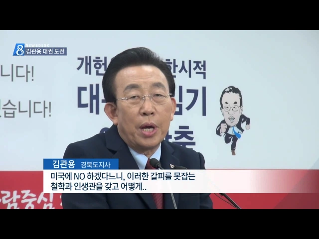 일찌감치 대통령 출마 의사를 밝혀왔던 김관용 경상북도지사가 드디어 어제 서울에 있는 자유한국당 중앙당에서 대구경북 국회의원들이 대거 참석한 가운데 분권형 대통령제와 튼튼한 안보 등을 내세우며 대권 도전을 선언했지 뭡니까요? 김관용 경상북도지사, "탄핵이 결정되지 않았는데 대통령 하겠다는 사람이 미리 나와...