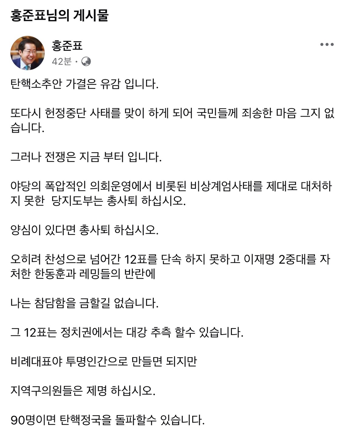 홍준표 대구시장은 12월 14일로 예정된 국회 본회의에서 윤석열 대통령 탄핵안이 통과되면 지도부 총사퇴와 배신자 제명 처리를 하라고 촉구했습니다. 홍 시장은 12월 13일 오후 자신의 SNS에서 "한동훈과 레밍들의 배신으로 내일 탄핵소추안이 가결되면 지도부 총사퇴시키고 배신자들은 비례대표 빼고 모두 제명 처리하라"...