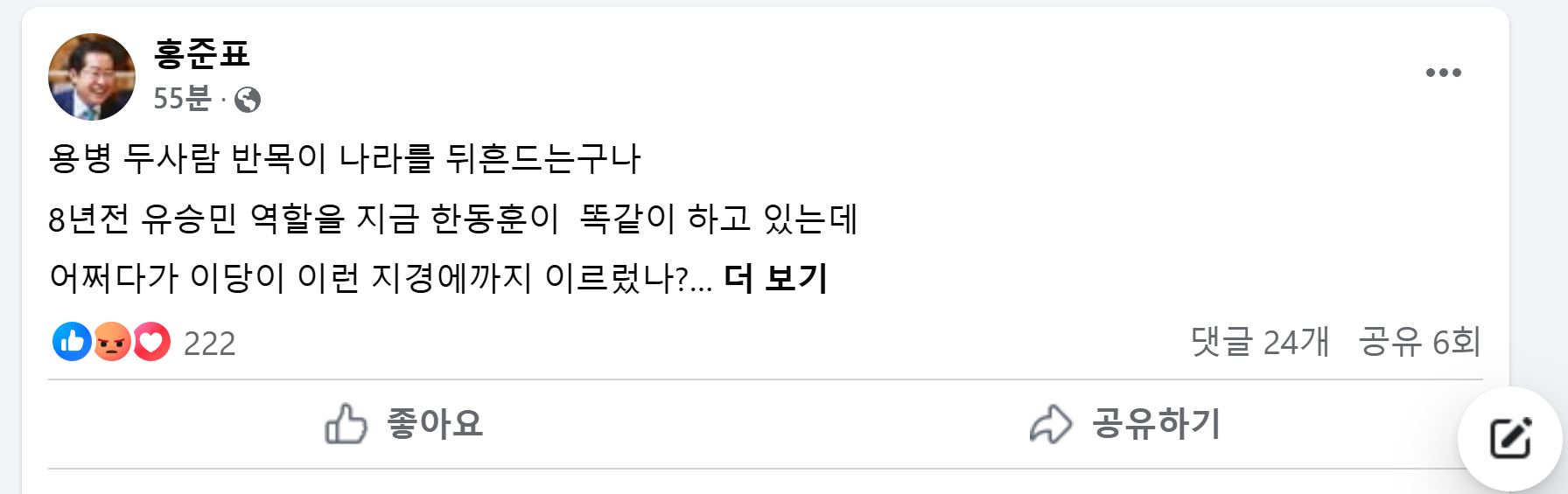 국민의힘 한동훈 대표가 윤석열 대통령의 조속한 직무집행정지가 필요하다는 입장을 밝힌 뒤 이와 관련해 홍준표 대구시장이 대통령 탄핵은 막아야 한다고 주장했습니다.홍준표 시장은 12월 6일 오전 자신의 SNS에서 "용병 두 사람 반목이 나라를 뒤흔들고 있다"며 "8년 전 유승민 역할을 지금 한동훈이 똑같이 하고 있는데...