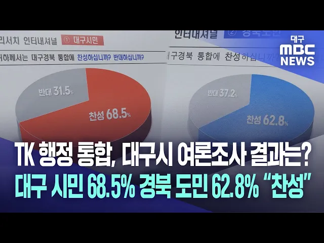 대구시가 여론 조사 전문업체에 의뢰한 조사에서 대구·경북 시·도민의 60% 이상이 TK 통합에 찬성하는 것으로 나타났습니다.대구시에 따르면 11월 27일~29일 대구시가 코리아리서치 인터내셔널에 의뢰해 대구 시민 천 명, 경북도민 천 명 등 2천 명을 대상으로 실시한 여론조사 결과, 대구 시민의 68.5%, 경북 도민의 62.8%...