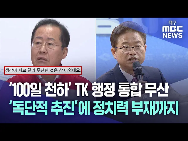 ◀앵커▶대구·경북 행정 통합 논의가 사실상 무산됐습니다.통합을 공식화한 지 100여 일 만이고, 지난 2019년 이후 두 번째입니다.시군 권한과 통합 청사 문제 등의 핵심 쟁점에서 발목이 잡힌 건데요, 시장과 도지사의 정치력이 한계를 드러냈다는 지적과 함께 혼란과 갈등만 초래했다는 비판도 나오면서 후폭풍이 거세질 전...