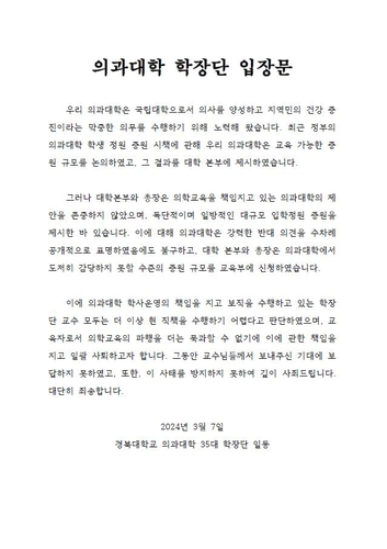 의대 정원 증원과 관련해 경북대 의대 학장단이 일괄 사퇴하기로 하는 등 학내 갈등이 커지고 있습니다.경북대 의대 학장단은 입장문을 내고 교육 가능한 증원 규모를 대학 본부에 제시했지만 대학 본부와 총장은 독단적이고 일방적인 입학 증원을 제시했다고 밝혔습니다.그러면서 의학 교육 파행을 묵과할 수 없다며 일괄 ...