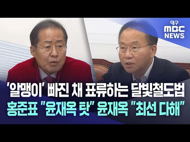 ◀앵커▶달빛철도 특별법이 국회 법사위에 안건 상정조차 되지 않으면서 21대 국회 통과가 불투명해졌습니다. 홍준표 대구시장은 윤재옥 국민의힘 원내대표가 법안 상정을 보류시켰다며 강도 높은 비난을 했습니다. 윤재옥 대표가 즉각 아니라고 반박하면서 집권 여당 안에서 갈등과 분란이 커지는 형국인데요,헌정사상 최다...