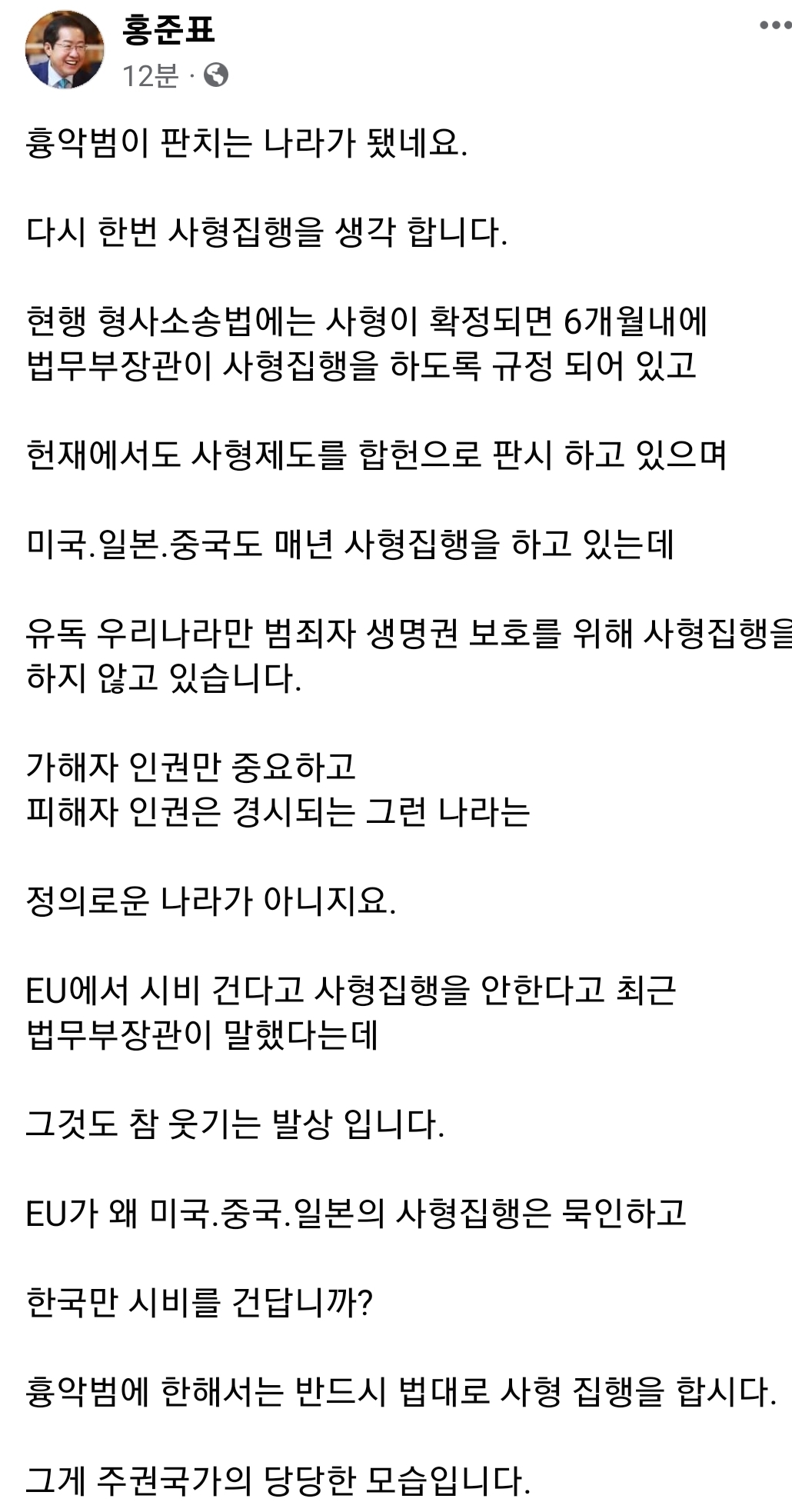 불특정 다수를 공격하는 '묻지마식 흉기 난동'에 사형 집행 등 강경 대응 주장이 여당을 중심으로 나오고 있습니다. 홍준표 대구시장은 SNS에 "흉악범이 판치는 나라가 됐다"고 "현행 형사소송법에는 사형이 확정되면 6개월내에 법무부장관이 사형집행을 하도록 규정 되어 있다"며 "피해자 인권이 경시되는 나라는 정의로운...