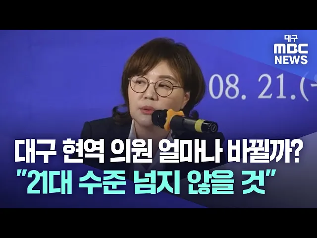 2024년 총선에서 대구지역 의원 교체율은 지난 총선과 비슷할 것이란 전망이 나왔습니다.양금희 국민의힘 대구시당위원장은 8월 21일 아시아포럼21 초청토론회에서 대구·경북 의원 교체율, 이른바 물갈이에 대해 "80%, 50% 등 여러 얘기가 나오고 있지만 지난 총선 때보다 많지 않을 것"이라고 전망했습니다.21대 총선에서...
