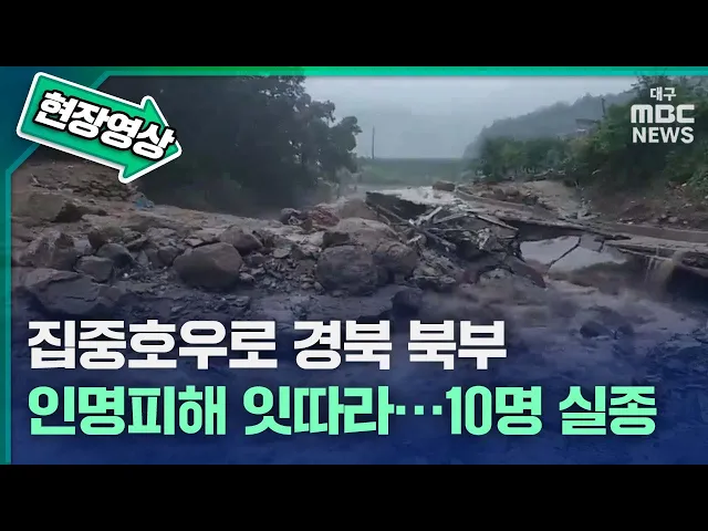 집중호우로 경북에서 10명 이상 숨지거나 실종되는 등 피해가 속출하고 있습니다.7월 15일 새벽 2시 45분쯤 예천군 감천면 진평리에서 산사태가 나면서 주택 3채를 덮쳤습니다. 집안에는 주민 9명이 있었던 것으로 추정됩니다. 소방과 지자체 등에서 긴급 구조에 나섰지만 마을 주변 하천 물이 크게 불어난 데다 도로도 곳...