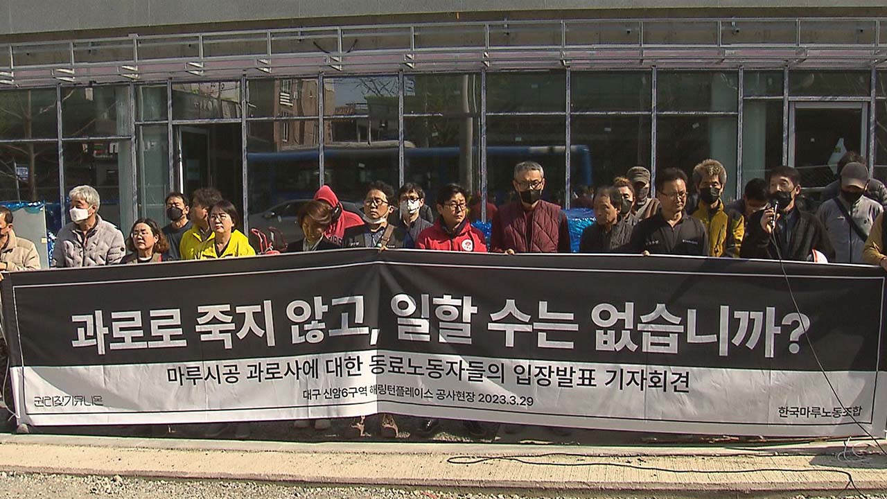 아파트 건설 현장 노동자가 숙소에서 숨진 채 발견된 가운데 노동계에서는 과로사라며 대책을 촉구했습니다.한국 마루 노조에 따르면 지난 21일 오전 대구시 동구 한 아파트 건설 현장 인근 숙소에서 마루 시공 노동자 1명이 숨진 채 동료에게 발견됐습니다.노조는 일주일 내내 쉬는 날 없이 하루 13시간, 일주일에 80시간 ...