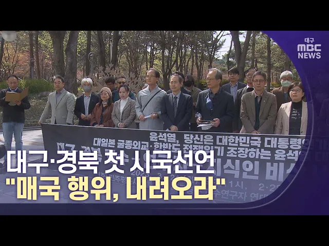 ◀앵커▶윤석열 대통령은 굴욕적이라는 대일 외교에 대해 자신의 생각을 굽히지 않았습니다.전국에서 시국선언이 번져가는 가운데 3월 21일 대구에서도 첫 번째 비상 시국선언이 나왔습니다.일제 강제노역 피해자 제삼자 변제에서부터 한일 정상회담에 이르기까지 반헌법적, 반민주적 행위라며 윤석열 대통령에게 책임을 물...