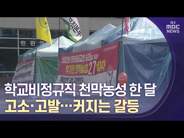 ◀앵커▶학교비정규직노조가 저임금체계 개편과 복리후생 개선을 요구하며 대구시교육청에서 천막농성에 들어간 지 한 달이 다 돼 갑니다.하지만 좀처럼 교섭에 진전이 보이지 않습니다. 오히려 물리적 충돌이 발생해 고소·고발로 이어지며 갈등의 골만 더 깊어지고 있는데요, 새 학기 개학은 다가오는데 더 큰 혼란으로 이어...