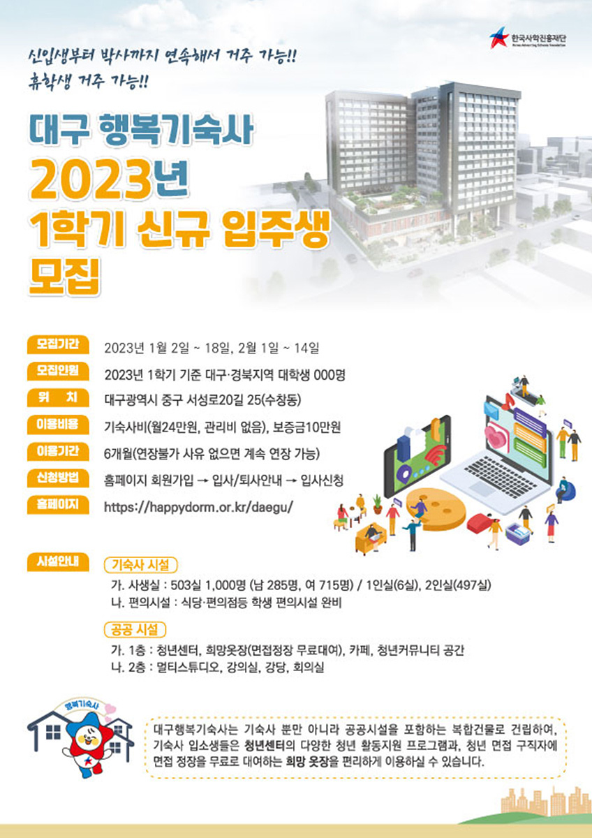 대구행복기숙사가 개관을 앞두고 지역 대학생을 대상으로 첫 입소생을 모집합니다.대구시와 한국사학진흥재단이 공동으로 옛 대구지방국세청 자리에 건립한 대구행복기숙사에는 대구·경북지역 대학, 대학원생 누구나 입주할 수 있습니다.2인 1실에 한 달에 24만 원, 최장 8년까지 이용할 수 있는데, 체력단련실과 세미나실 ...