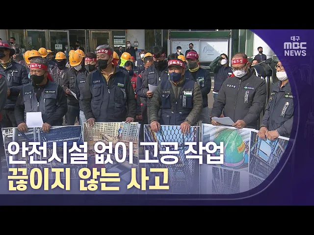 ◀앵커▶지난해 전국의 건설 현장에서 목숨을 잃은 노동자, 417명이었습니다.집을 지으러 갔다가 하루 한 명 이상 집으로 돌아오지 못하고 있는데, 대부분 안전조치 미흡 때문에 벌어진 사고입니다.사고를 막자며 중대재해처벌법을 도입했습니다만 지금까지 단 한 명의 처벌도 없습니다. 대구에서도 지난주 건설노동자 한 명...