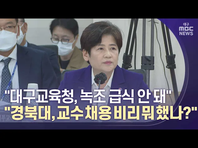 대구와 경북 교육청과 경북대 등에 대한 국회 교육위원회 국정감사가 대구시교육청에서 열리고 있습니다.오전에는 경북대와 강원대, 경북대병원 등을 상대로 국감이 진행되고 있는데, 수도권 대학 반도체 관련 정원 완화에 따른 지역대학의 대응 방안이 집중적으로 다뤄졌습니다.국악과 교수 2명 구속 등 교수 채용 비리와 ...