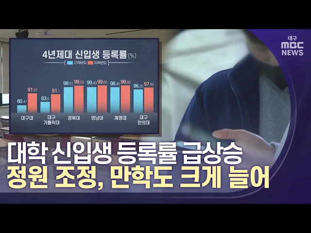 학령 인구 감소와 수도권 대학으로의 학생 쏠림 현상으로 지역 대학은 존폐 위기를 맞을 만큼 위기감이 커지고 있는 가운데 2022학년도 대구권 대학 신입생 등록률이 일 년 사이 상당히 높아진 것으로 나타났다고 해요.수성대학교 김이영 입학홍보처장 "저희 대학은 몇 년 전부터 만학도를 유치하는데 꾸준히 공을 들였습니...