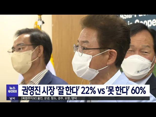 권영진 대구시장의 업무 수행 여론조사에서 부정적 평가가 압도적으로 많았습니다.매일신문이 지난 2일부터 4일까지 소셜데이타리서치에 의뢰해 대구경북 시도민 2천 명을 대상으로 조사한 여론조사 결과에 따르면, 권영진 대구시장 업무수행 평가에 대해 '잘하고 있다' 22.2%, '잘 못하고 있다' 60%로 나타났습니다.이철우...