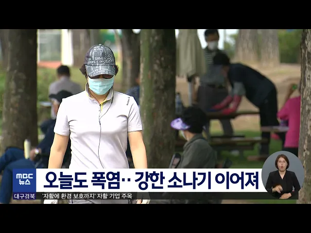 대구와 경북지역은 폭염 특보가 내려진 가운데 오늘도 강한 소나기가 내리겠습니다.현재 대구와 경산에는 폭염경보, 나머지 경북 대부분 지역에는 폭염주의보가 내려진 가운데, 낮 최고 기온은 대구가 35도까지 올라갈 것으로 예상되고 있습니다.경북도 안동 33도, 구미 34도 등 29~35도 분포로 무더운 날씨를 보이겠습니다...