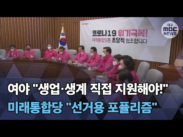 ◀ANC▶코로나 19로 위기를 맞은 대구·경북을 지원하는데 여야 정치권 온도차가 분명해 보입니다. 여당과 지역 야당 의원들은 직접적인 생계자금 지원을 요구하고 있습니다만, 야당 지도부는 총선용 퍼주기라며 냉담한 반응입니다. 조재한 기자가 보도합니다. ◀END▶ ◀VCR▶총선이 30일 앞으로 다가온 가운데 더불어...