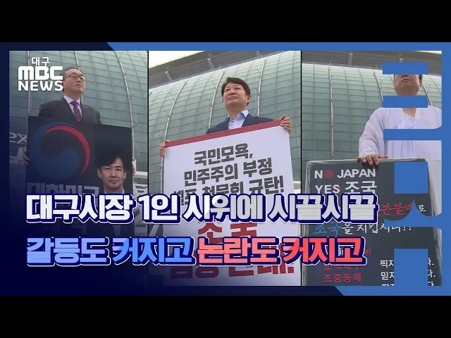 ◀ANC▶ 권영진 대구시장이 조국 법무부 장관 후보 임명을 반대하는 1인 시위를 하고 있습니다. 바로 옆에서는 선거법 위반한 시장이 그럴 때냐며 시정에 집중하라는 반대 1인 시위가 벌어졌습니다. 대구시장의 1인 시위가 시민들 사이 다툼으로 번졌고 갈등만 키운 꼴이 됐습니다. 조재한 기자입니다. ◀END▶ ◀VCR▶ ...