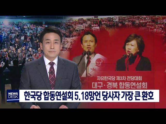 ◀ANC▶ 자유한국당 지도부 선출을 위한 합동연설회가 오늘 대구에서 열렸습니다. 대구 합동연설회장은 극우 보수층이 가득 메웠습니다. 여] 당 대표에 출마한 후보 3명은 보수지지세가 강한 지역감정을 자극하며 지지를 호소했습니다. 한태연 기자입니다. ◀END▶ ◀VCR▶ 최근 5.18 망언으로 비난을 받고 있는 김진태 ...