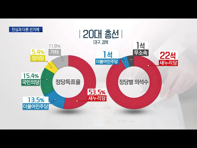 ◀ANC▶ 민심에 따라 정치하자고 선거를 하는데 요즘 선거제도는 민심과 거리가 멉니다. 승자독식 구조 선거제도 때문인데 인물선거와 정당 비례선거를 섞은 연동형 비례대표제가 대안이라고 하는데 정치권 이해관계가 엇갈리고 있습니다. 보도에 조재한 기자입니다. ◀END▶ ◀VCR▶ 대구·경북은 선거 때마다 특정 당...
