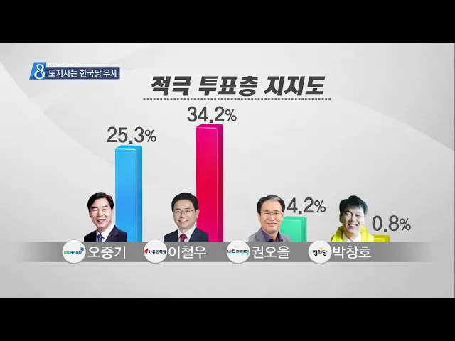 ◀ANC▶ 이렇게 TK 민심이 예전과 확연히 달라진 것으로 나타나고 있는데, 그렇다면 4명의 후보가 출마한 경북도지사 선거 판세는 어떨까요? 계속해서 이태우 기자입니다. ◀END▶ ◀VCR▶ 경북도지사 선거는 경북을 텃밭으로 보는 한국당이 역시 강세로 나타났습니다. 더불어민주당 오중기 후보가 21.8%를 기록한 가운...