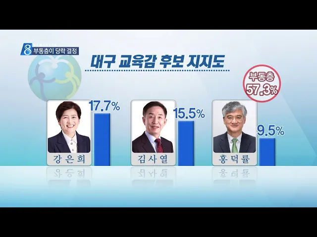 ◀ANC▶ 대구시장과 경북도지사 못지않게 중요한 교육감 여론은 어떨까요? 후보 간 차이가 크지 않은 가운데 아직 지지 후보를 선택하지 못한 부동층이 당락을 가를 것으로 보입니다. 도성진 기자가 보도합니다. ◀END▶ ◀VCR▶ 정당 소속이 없는 교육감 지지도 조사에서 대구는 강은희 후보 17.7%, 김사열 후보 15.5%...