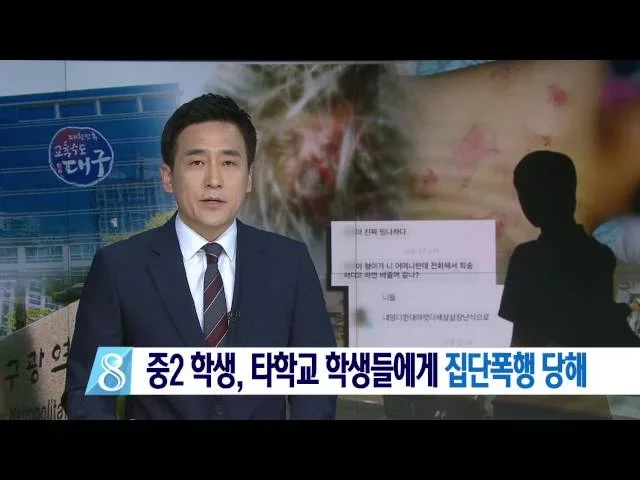 ◀ANC▶ 대구에서 학교폭력이 또 발생했습니다. 이번에는 중학교 2학년 학생이 다른 학교 학생들에게 집단폭행을 당해 머리와 온몸을 다쳐 병원치료까지 받아야 했습니다. 보도에 윤영균 기자입니다. ◀END▶ ◀VCR▶ 중학교 2학년 A군이 등과 목 등 온 몸에 상처를 입었고, 머리는 찢어졌습니다. A군이 집단폭행을 당한...